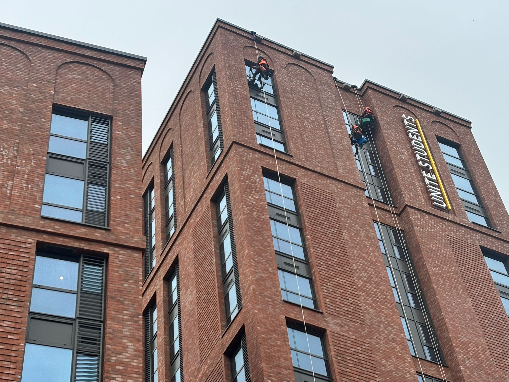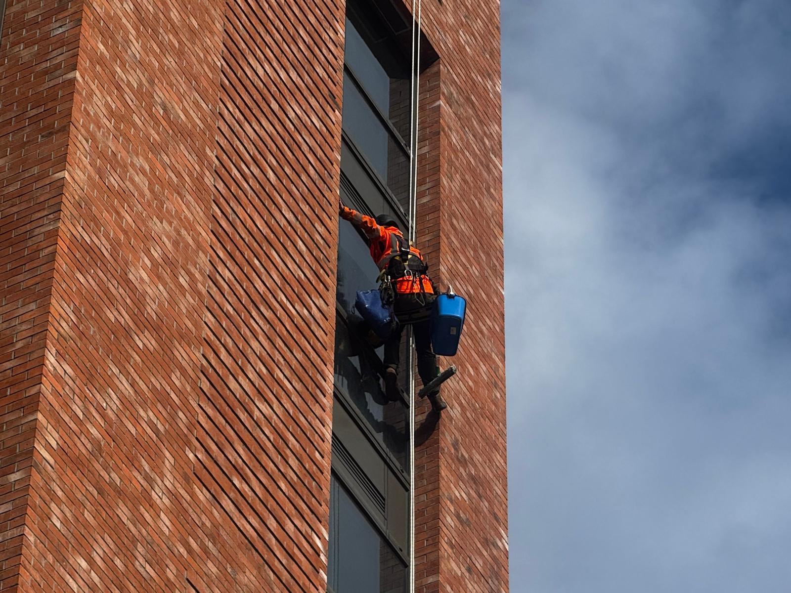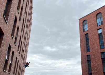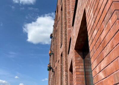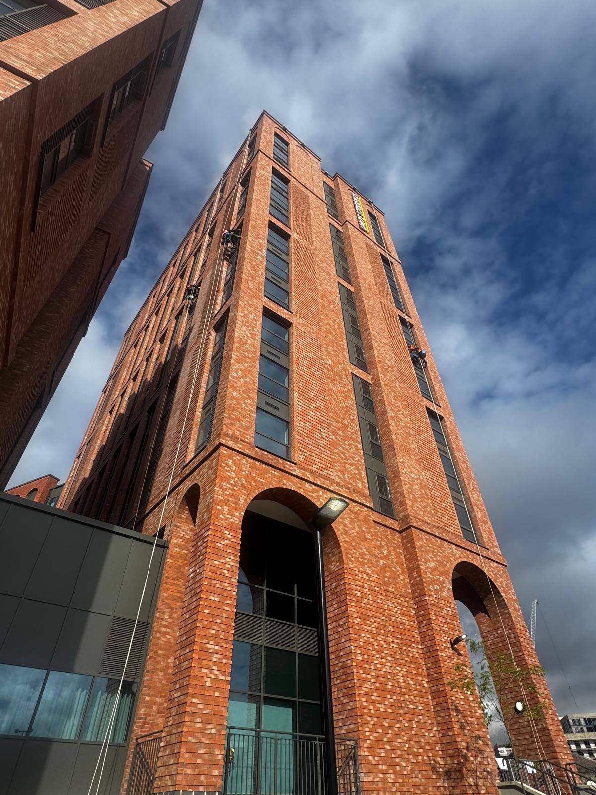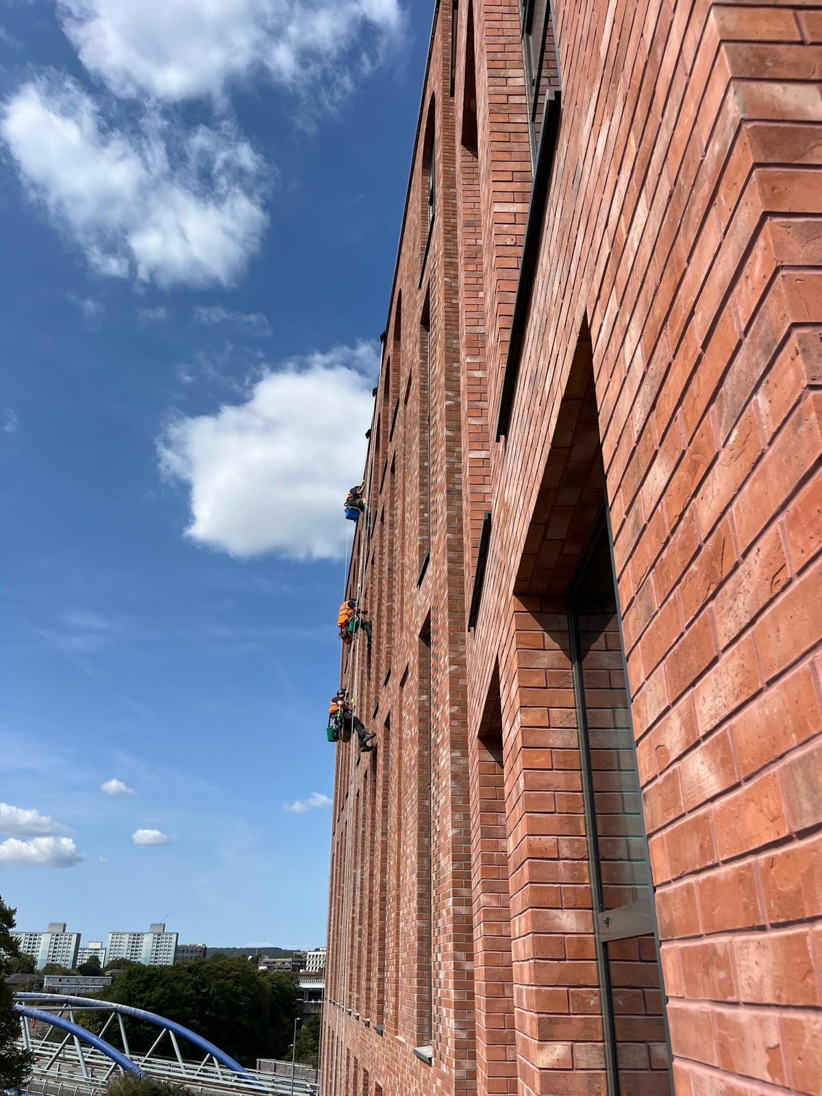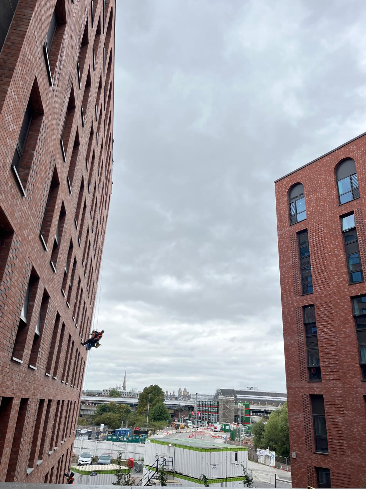 The project required specialist rope access expertise to safely access and clean external façades while coordinating with ongoing site activities.